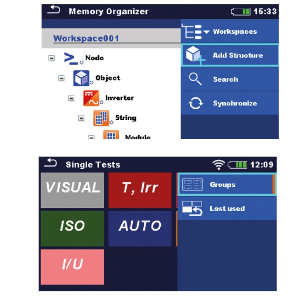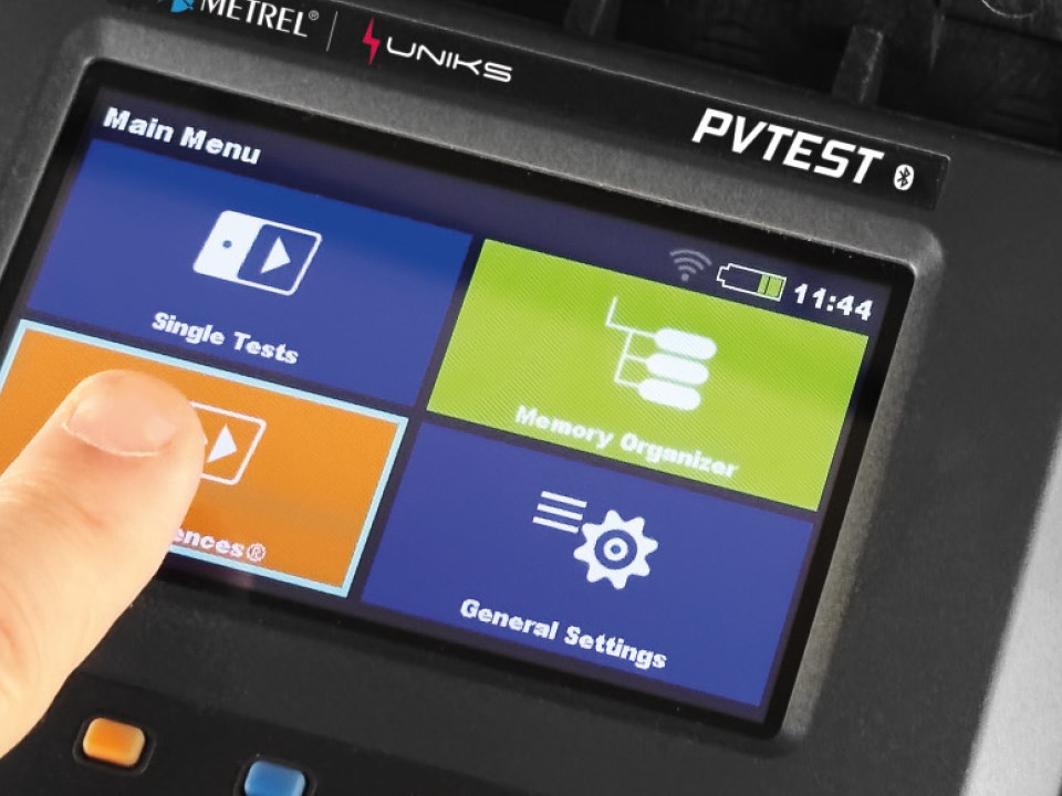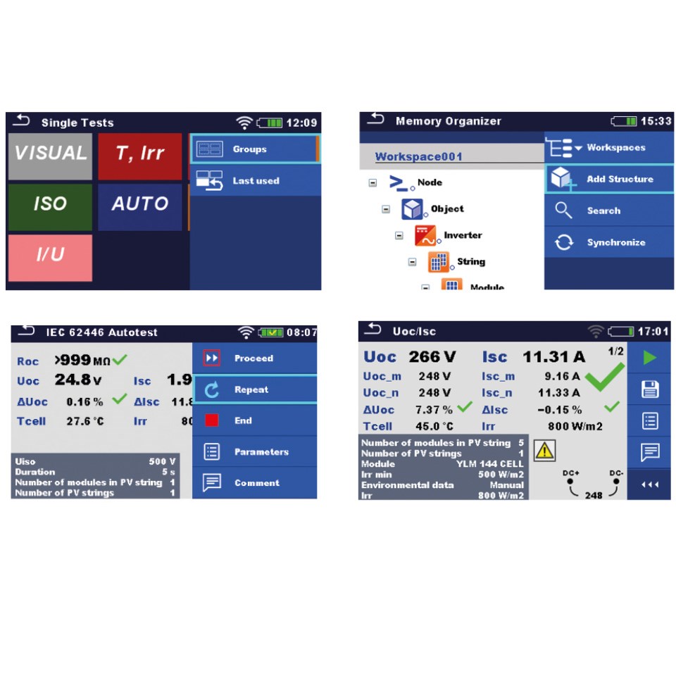 Alimentazione Li-Ion, 14.4 V, 4400mAh Durata batterie 1000 misure Display Colori TFT Touch Screen Memoria 3000 risultati Interfaccia PC USB/WiFi per scarico su PC Sicurezza IEC61010-1 Temperatura Operativa 0 ÷ 40°C Categoria di misura CAT II 300V Altitudine operativa fino a 2000M Grado di inquinamento 2 Normativa di riferimento EN 62446-1