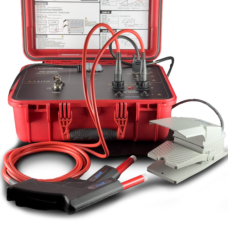 La tensione di prova verrà applicata alle pistole di prova indipendentemente dal valore della corrente di dispersione. Anche in caso di cortocircuito il test non verrà interrotto, fare attenzione a rispettare l’uso INTERMITTENTE in questo caso, vedere le specifiche tecniche nel Manuale utente Adattatore ad alta tensione HV5100 . La corrente di dispersione limite può essere regolata su 1… 100 mA e viene utilizzato solo per la valutazione finale del risultato del test.